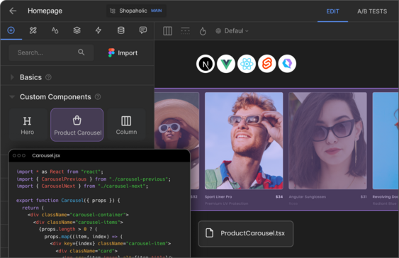 Integrate with your existing code and design system. Developers build components in their preferred front-end framework, register them with the editor, and let marketers create experiences without coding.